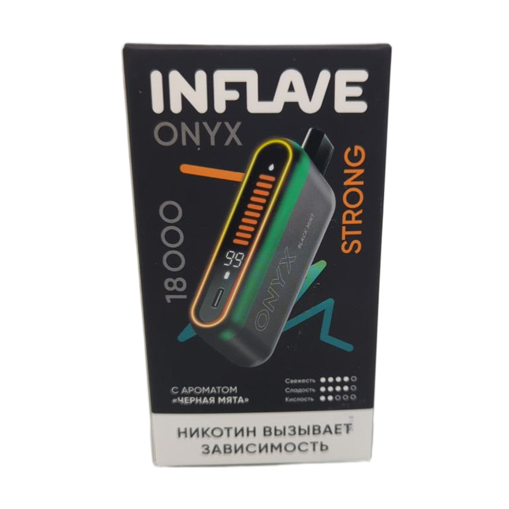 Одноразовые электронные сигареты INFLAVE ONYX 18000 STRONG со вкусом Черная мята — новинка от бренда INFLAVE. Аккумулятор емкостью на 850 mAh с возможностью подзарядки через разъем USB Type-C и бак с 16 мл предзаправленной жидкости (Солевой никотин крепостью 2% (20 мг/мл) Strong) позволяют совершить до 18000 затяжек. Хватит примерно на 36 дней