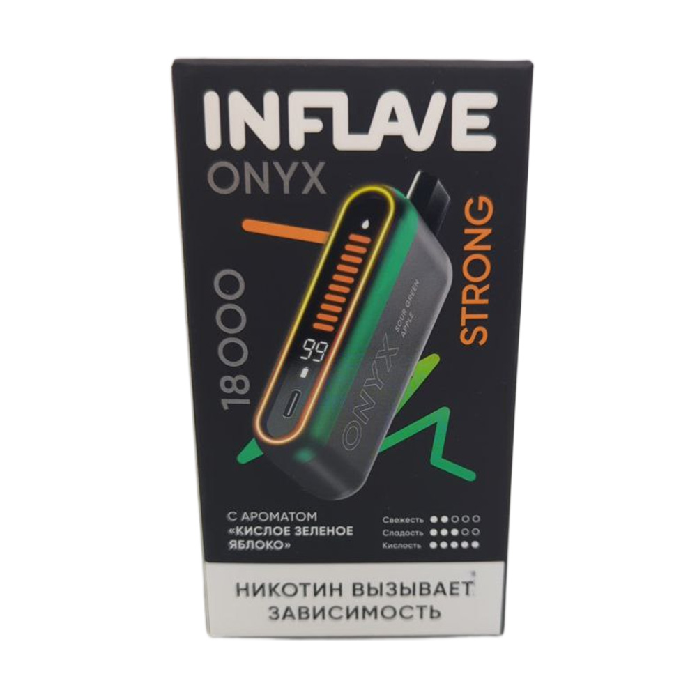 Одноразовые электронные сигареты INFLAVE ONYX 18000 STRONG со вкусом Кислое зеленое яблоко — новинка от бренда INFLAVE. Аккумулятор емкостью на 850 mAh с возможностью подзарядки через разъем USB Type-C и бак с 16 мл предзаправленной жидкости (Солевой никотин крепостью 2% (20 мг/мл) Strong) позволяют совершить до 18000 затяжек. Хватит примерно на 36 дней